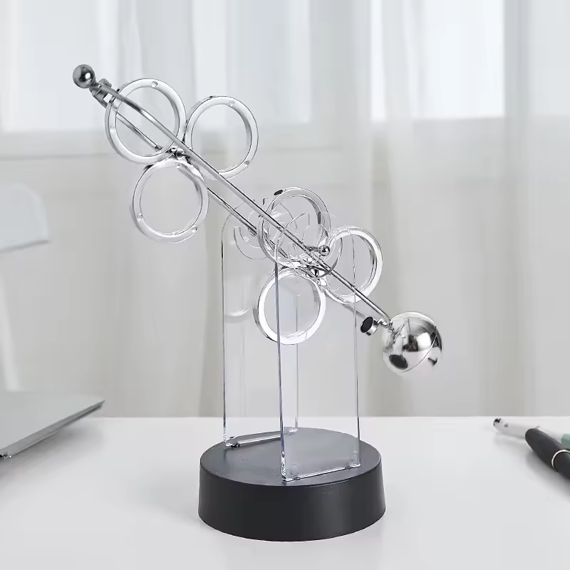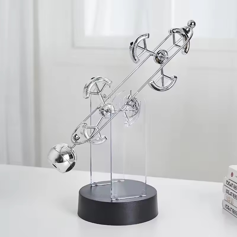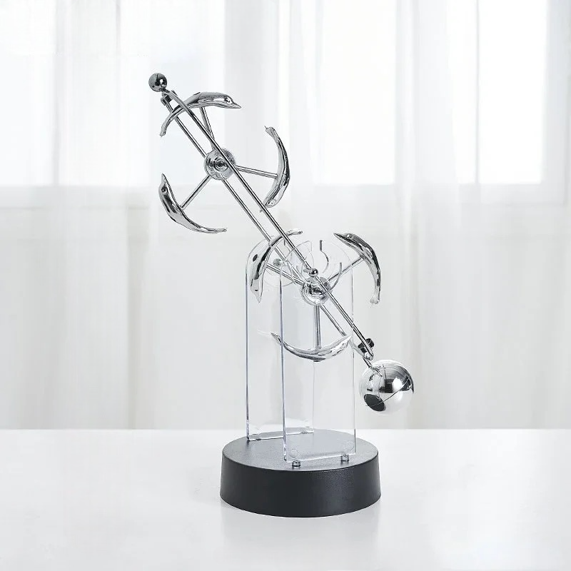 Un bras en métal qui oscille d’un côté à l’autre au-dessus d’un socle en plastique noir, alimenté par deux piles AA. Le balancier cinétique fonctionne en boucle : un électroaimant dans la base donne une impulsion au bras à chaque passage, et le mouvement se maintient sans intervention. Quatre formes décoratives au bout du bras : dauphin, gouvernail, cercle ou parapluie. 10 x 10 x 30 cm.